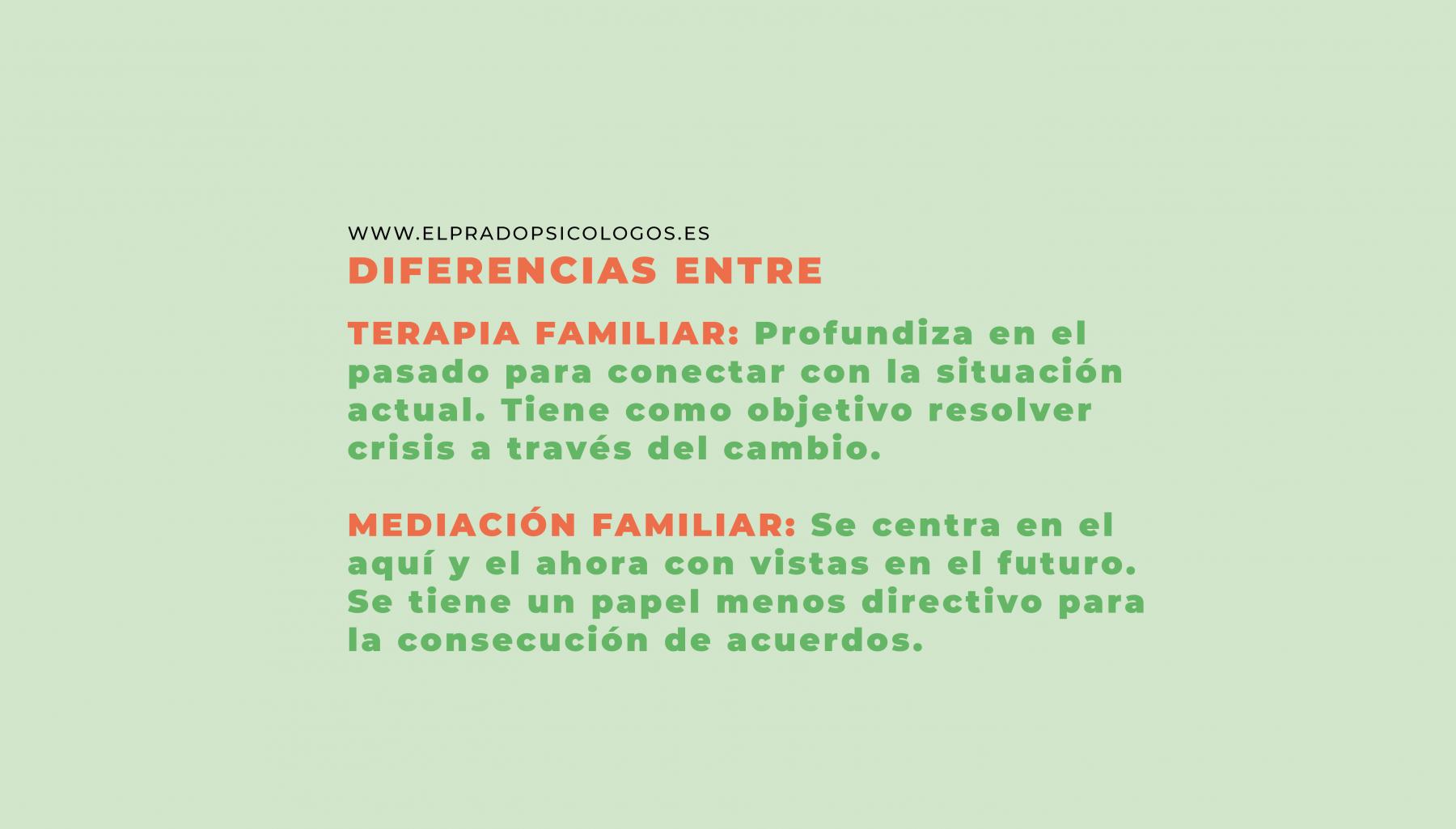 Tanto la mediación como la terapia implican una intervención en la familia para favorecer el desarrollo de sus miembros. Sin embargo, la terapia familiar implica un proceso de asesoramiento para ayudar a las familias a resolver determinadas crisis o problemas, por lo que a menudo es necesario profundizar en el pasado y conectar la historia familiar con la situación actual. Su principal objetivo es promover un cambio positivo en la dinámica familiar que les ayude a afrontar de mejor manera los retos habituales por los que atraviesa una pareja o familia.