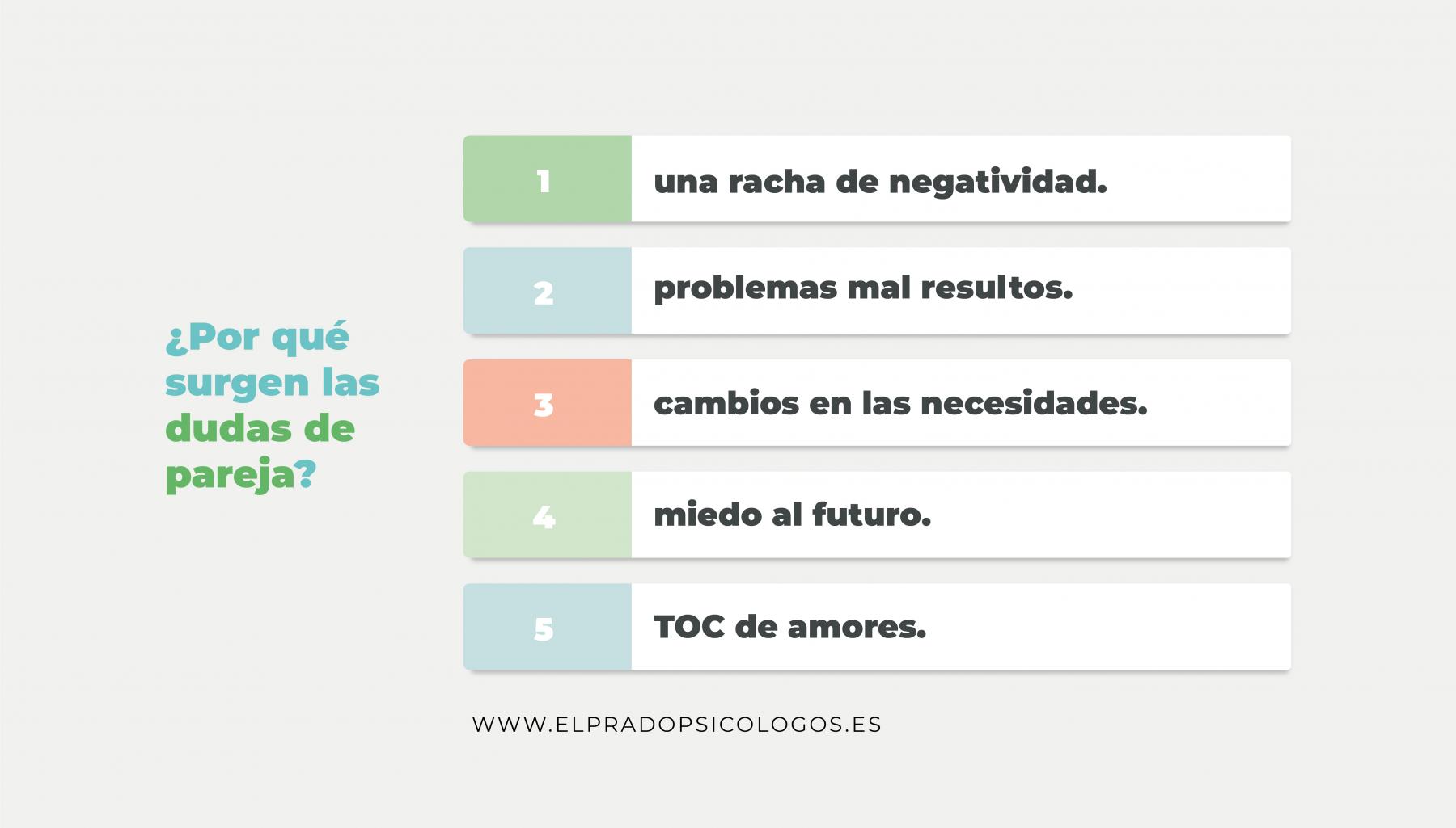 - Una mala racha de negatividad. A veces las dudas surgen como resultado de una mala racha. Cuando estás atravesando por momentos particularmente tensos, ya sea por problemas en el trabajo o con la familia, estos generan un estado marcado por el agobio y el cansancio, de manera que los pequeños errores que comete la pareja son percibidos como fallos insoportables.